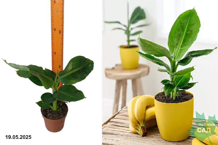 Величественное растение из тропиков с крупными веслообразными плотными листьями. Банан представляет собой растение-стебель, которое образовано из черешков листьев. Листья скручиваются между собой и образуют ложный ствол. Молодые растения имеют на листьях немногочисленные темно-бордовые или фиолетовые пятна, которые исчезают по мере созревания листа. Крупные листья растения достаточно тонкие и хрупкие, поэтому легко рвутся, часто ломаются под собственным весом. Это считается частью их очарования, а новые листья появляются очень быстро.