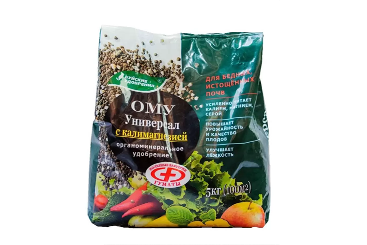 Комплексное гранулированное органоминеральное удобрение Универсальное с калимагнезией 5 кг. Назначение: ОМУ Универсальное с калимагнезией предназначено для овощных, плодово-ягодных и декоративных культур на бедных почвах (песчаных, тундровых и пр.) или истощенных активным использованием. Применяется для внесения в почву под основную обработку и для корневых подкормок в сухом виде. ОМУ - комплексное гранулированное удобрение пролонгированного действия, производится на основе низинного торфа, в состав которого входят гуминовые вещества, макро- и микроэлементы. ОМУ работает ранней весной, когда растениям необходима стимуляция роста, летом - в период активной вегетации и осенью, укрепляя растения на зиму благодаря его пролонгированному действию.