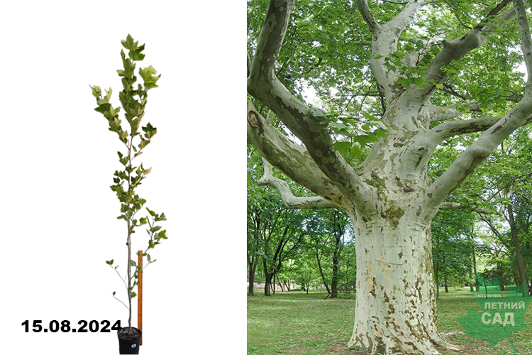 Быстрорастущий сорт высотой до 15-20 м. Годовой прирост в высоту 30 см, в ширину 25 см. Форма кроны широкопирамидальная, густая, раскидистая. Дерево интересно окраской ствола. Он покрыт светлыми пятнами, которые эффектно смотрятся на фоне шаровидных плодов. Листья крупные, зеленые, похожи на кленовые, чаще 5-лопастные, длиной 40-45 см, расположены очередно. Осенью раскидистая крона становится желтой и коричневой. Для посадки лучше выбрать светлое место с плодородной почвой. Подходит для смешанных, древесно-кустарниковых групп, массивов. Используется в парках и в садах как солитер, в аллейных посадках.