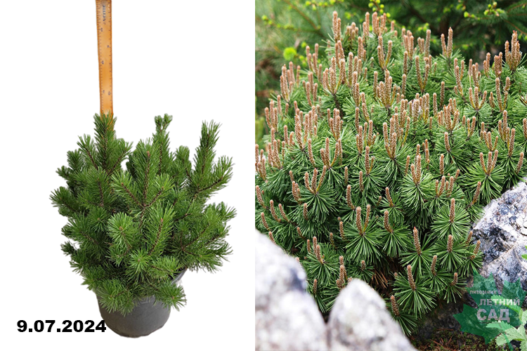 Кустарниковая форма густой сосны. Растет медленно. Распростертая стелющаяся крона. Вырастает до 2-3 м в высоту, в диаметре до 2-3 м. Побеги короткие, изогнутые к верху. Ежегодный прирост 10 см в высоту и 12 см в ширину. Поверхность ствола покрывает бурая кора высокой плотности. Хвоя темно-зеленого цвета, длиной около 4 см, собрана по две хвоинки, игольчатая, иногда перекрученная, жесткая. С 6-8 лет начинают появляются шишки. Шишки светло-коричневого цвета, ширококонусовидные, сидячие, около 3-6 см. Крепкие ветви не подвержены разломам под тяжестью снега. Светолюбива. К почвам нетребовательна, хорошо растет даже на бедных сухих грунтах, но предпочитает свежие хорошо дренированные суглинки и супеси. Используют для создания групповых и одиночных посадок, в смешанных композициях. Незаменима в садах японского стиля, в рокариях.