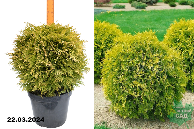 Хвойный шаровидный медленнорастущий кустарник, новый сорт, полученный мутацией сорта Даника. Настоящий хвойный карлик, вырастающий не более 80 см в диаметре. Крона плотная, хвоя желто-зеленая, чешуевидная. Зимой хвоя приобретает бронзовый окрас, весной снова желтеет. Прекрасно смотрится в групповых посадках, при создании каменистых и вересковых садов, древесно-кустарниковых и хвойных композиций, используется для живых изгородей. Прекрасно смотрится и как солитер, на балконах и террасах.