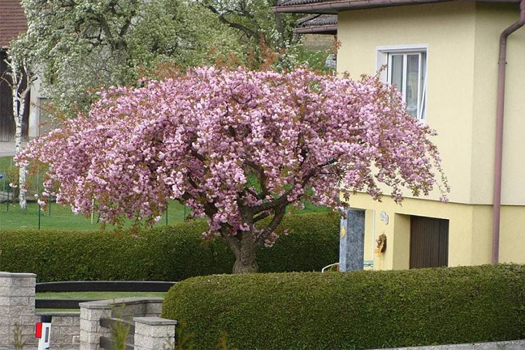 Листопадное небольшое дерево с поникающими, дугообразно свисающими ветвями и нерегулярной кроной. Листья зелёные, блестящие, становятся желто-оранжевыми осенью. Махровые, ароматные, розовые цветки, диаметром 6 см, на длинных цветоножках, собраны в густые соцветия, расположенные вдоль всей длины ветвей. Цветёт в мае. Сакура на штамбе прекрасно подходит для озеленения парков и садов в одиночных и групповых посадках, в качестве солитера. Предпочитает солнечное место, выносит легкую полутень, при хорошем освещении лучше цветет. Устойчива к жаре и солнечным ожогам. Штамб высотой 160-180 см.